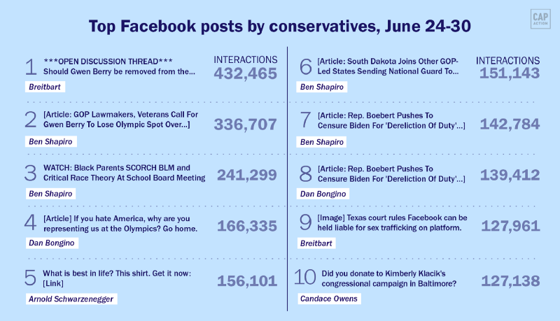This past week, top posts from conservatives included transphobic content about Olympic athletes and posts disparaging the teaching of critical race theory in schools. Conservatives’ top post was an “open discussion” thread from Breitbart, a tactic the page uses often to promote engagement.
